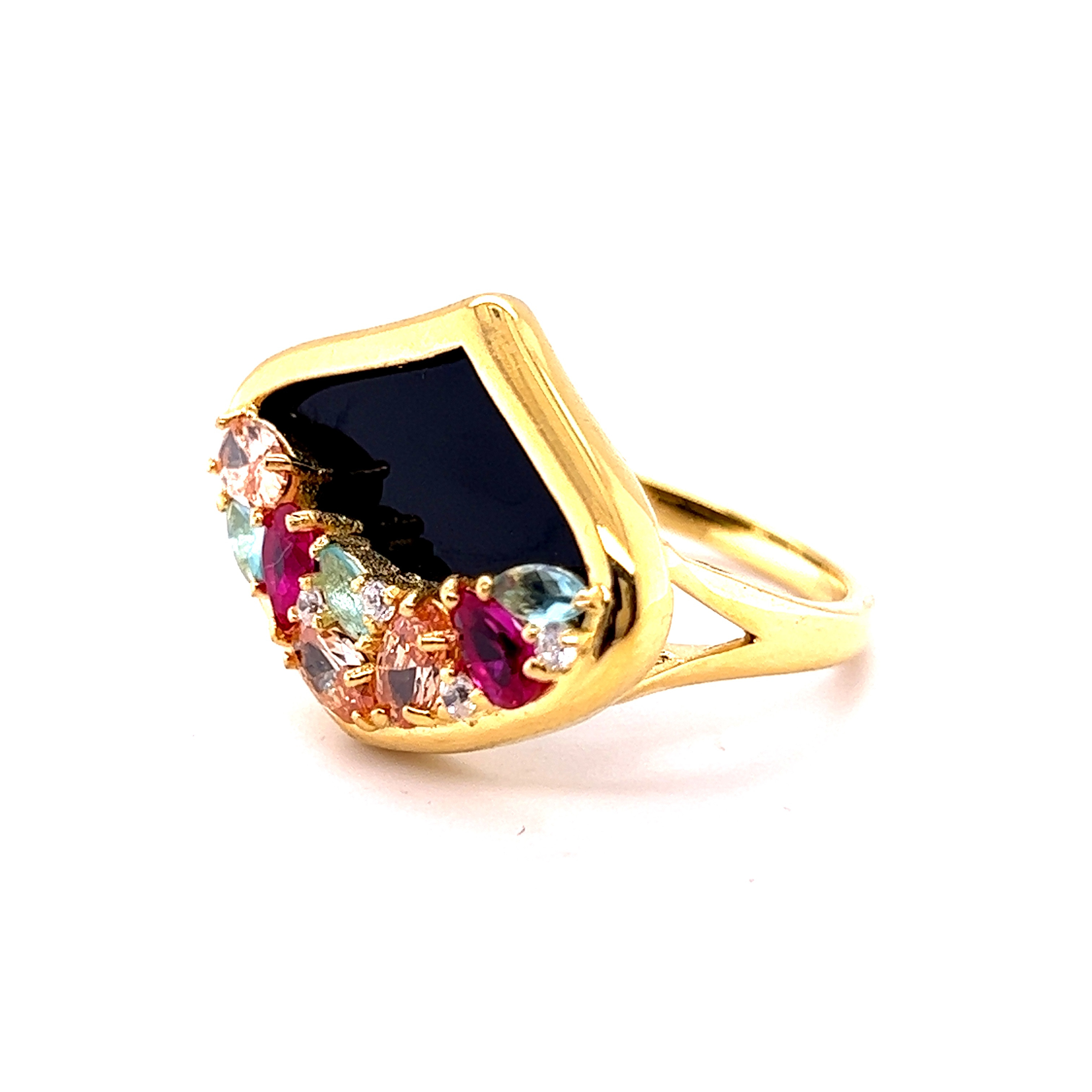 Пръстен от “Jacklin hugasian” в сребро с позлата , оникс и разноцветни камъни.