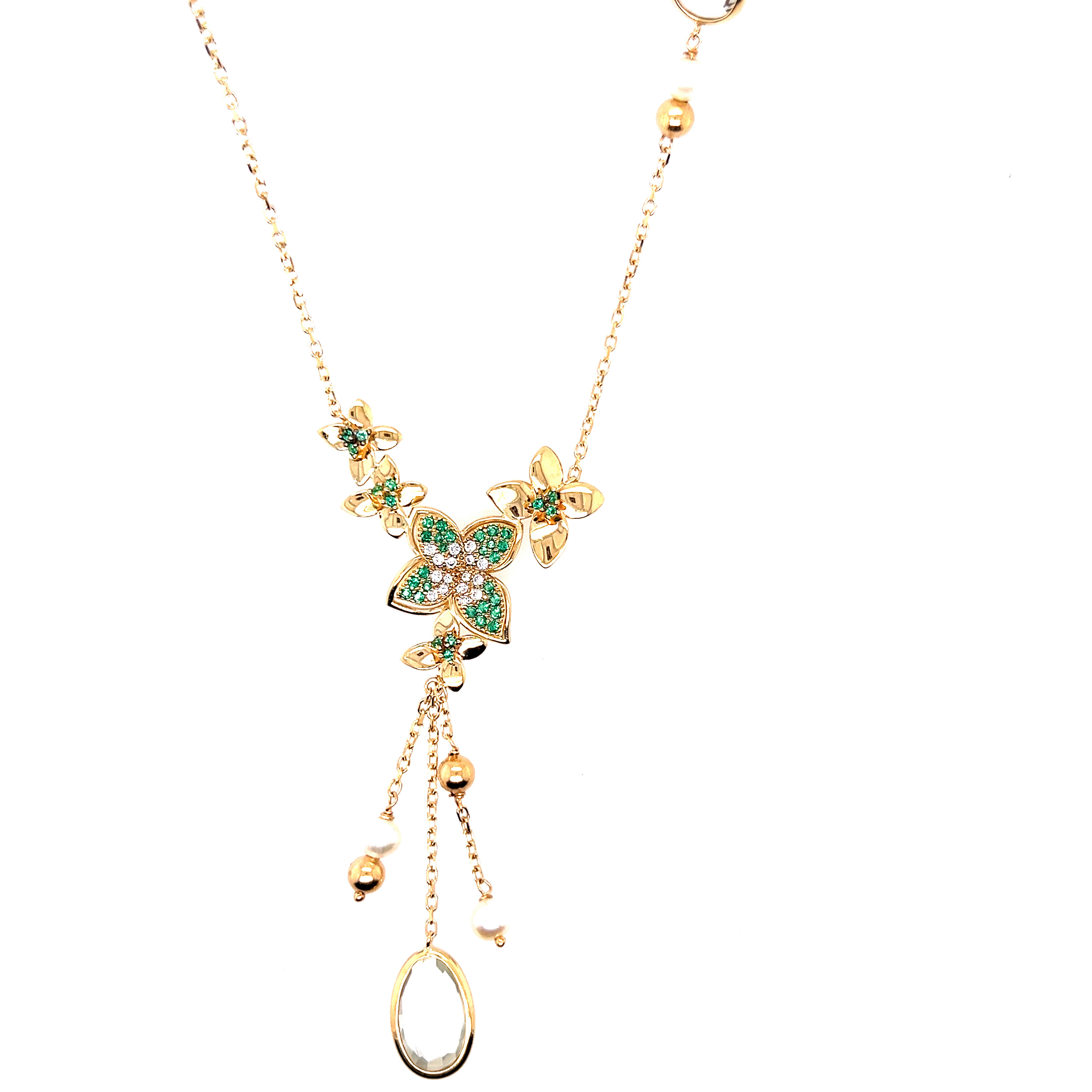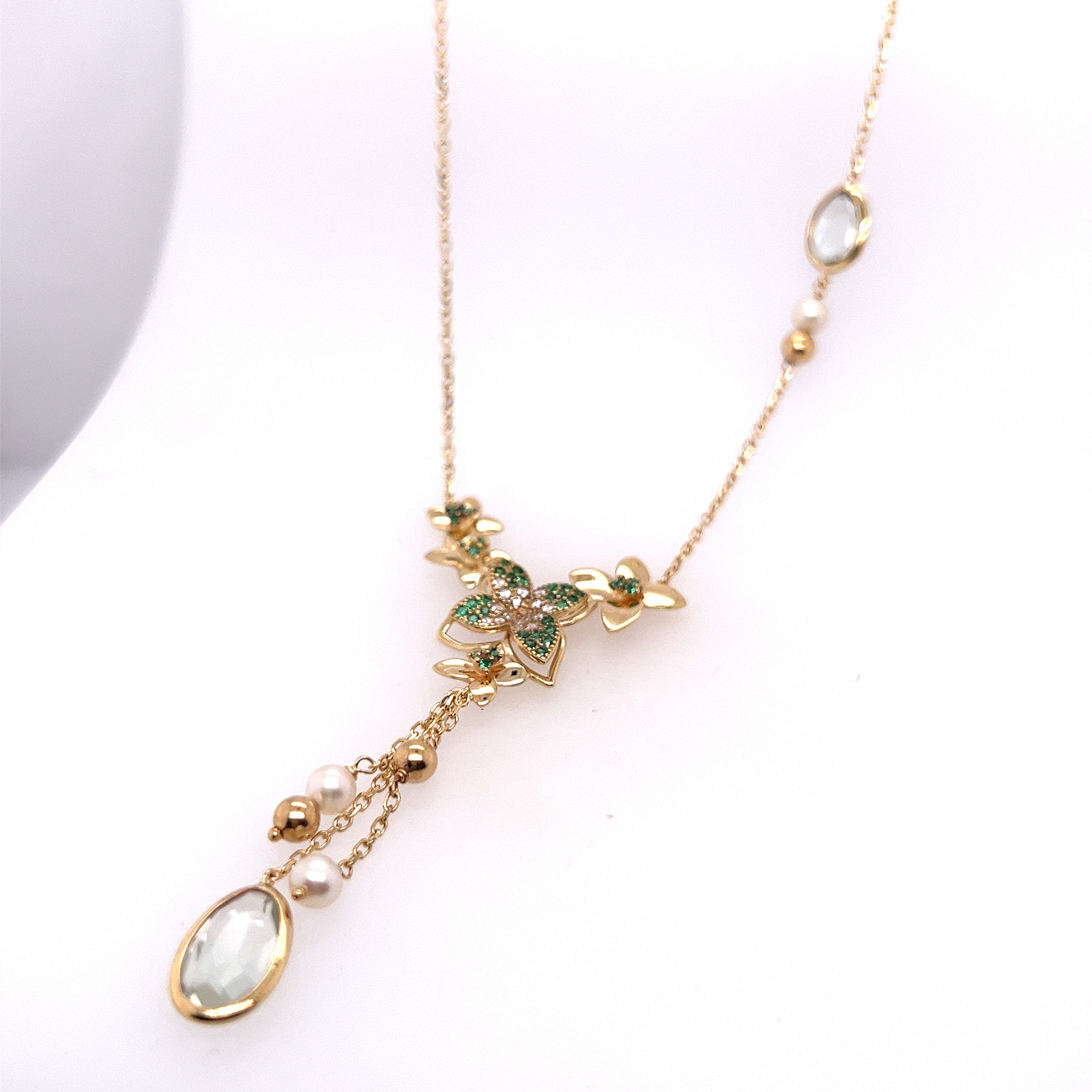 Колие от “Jacklin hugasian” в жълто злато с перла,аквамарин,турмалин и циркони.