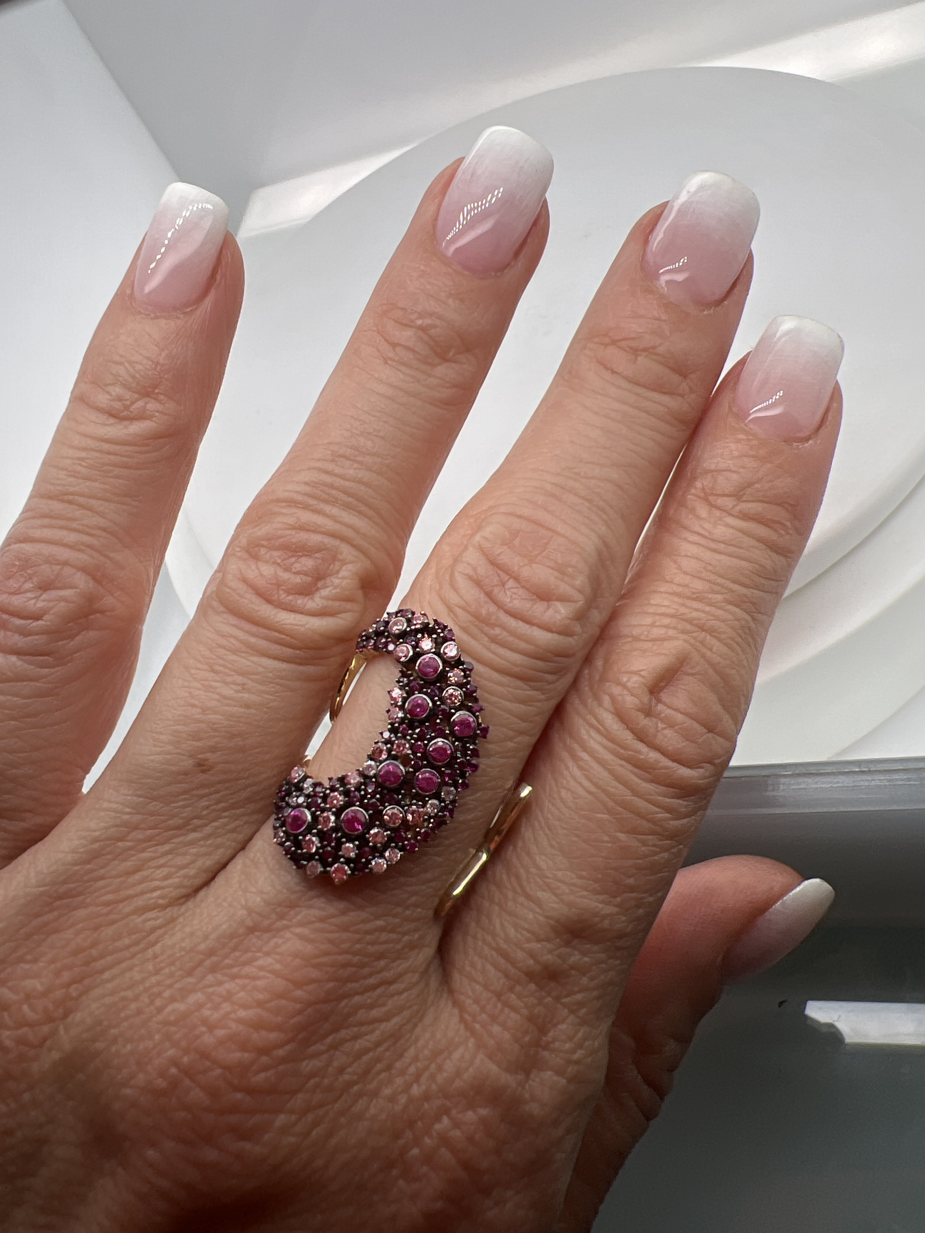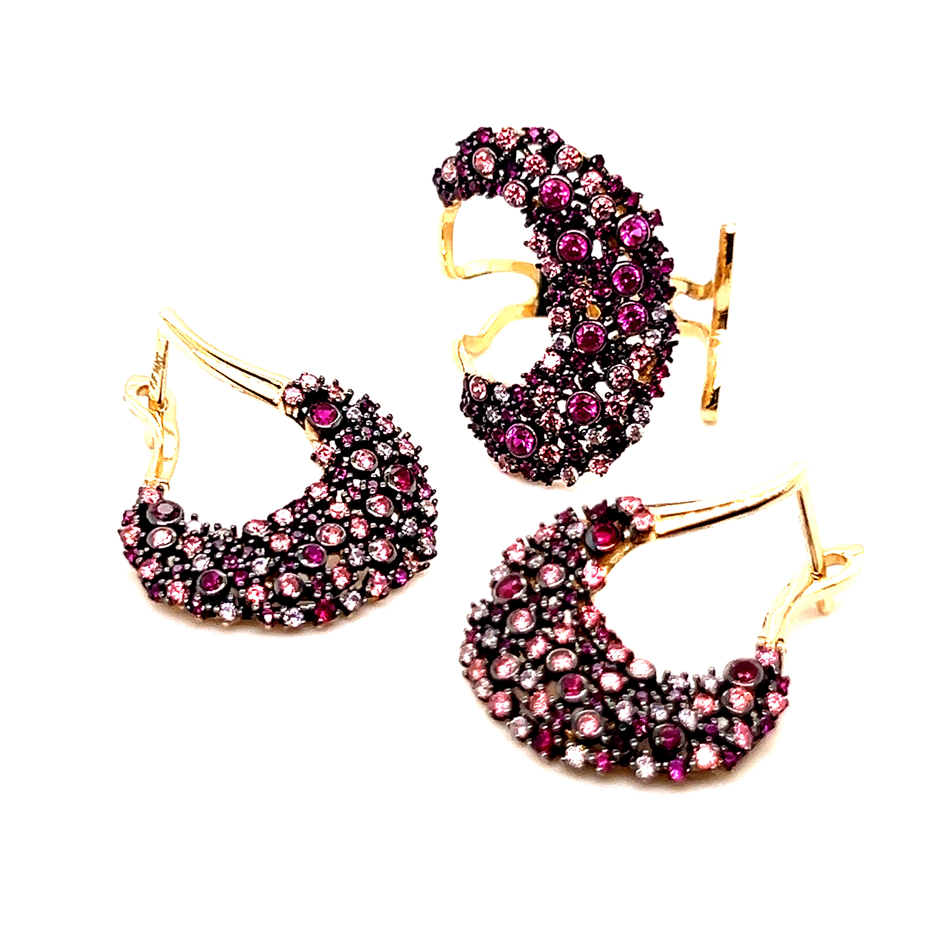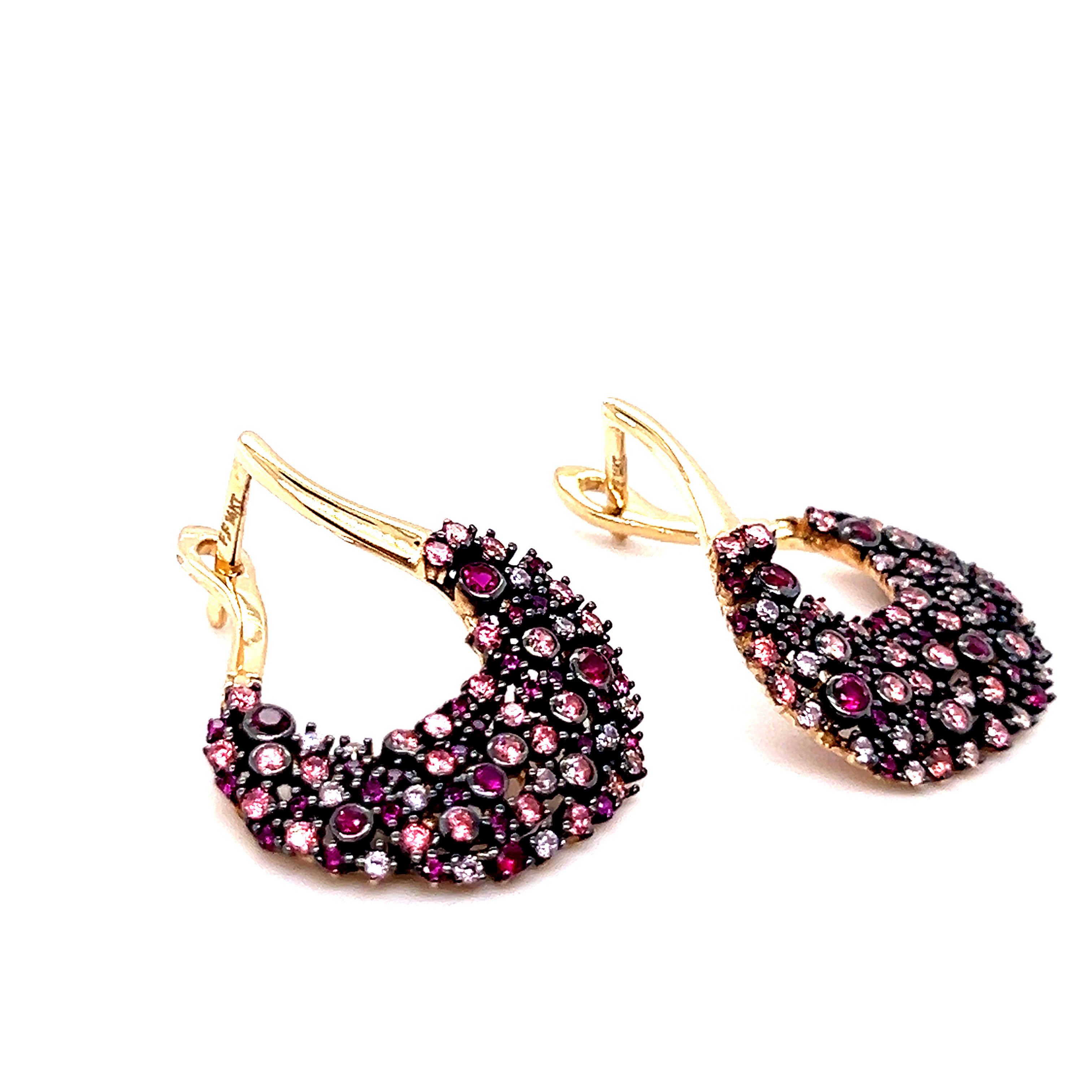 Обеци от “Jacklin hugasian” в жълто злато, със синтетичен рубин, розов кварц и цирконии