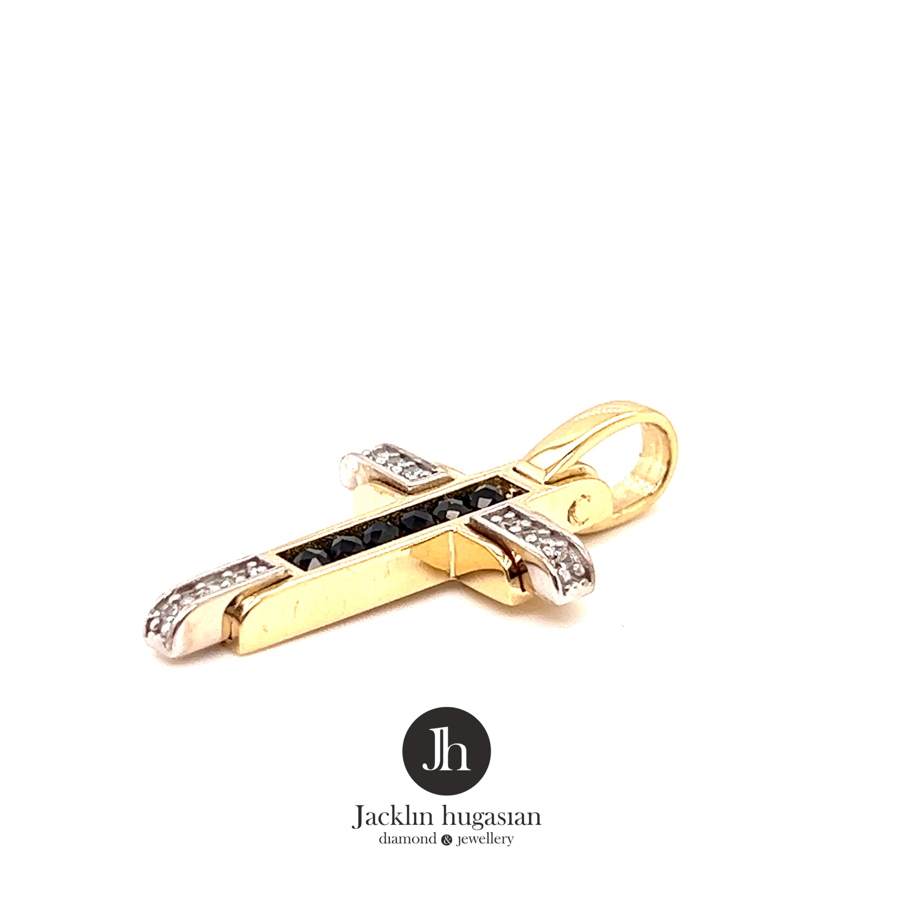Висулка от " Jacklin hugasian " в жълто злато с оникс и циркони. Дължина: 3.0 см., широчина 1.7 см.