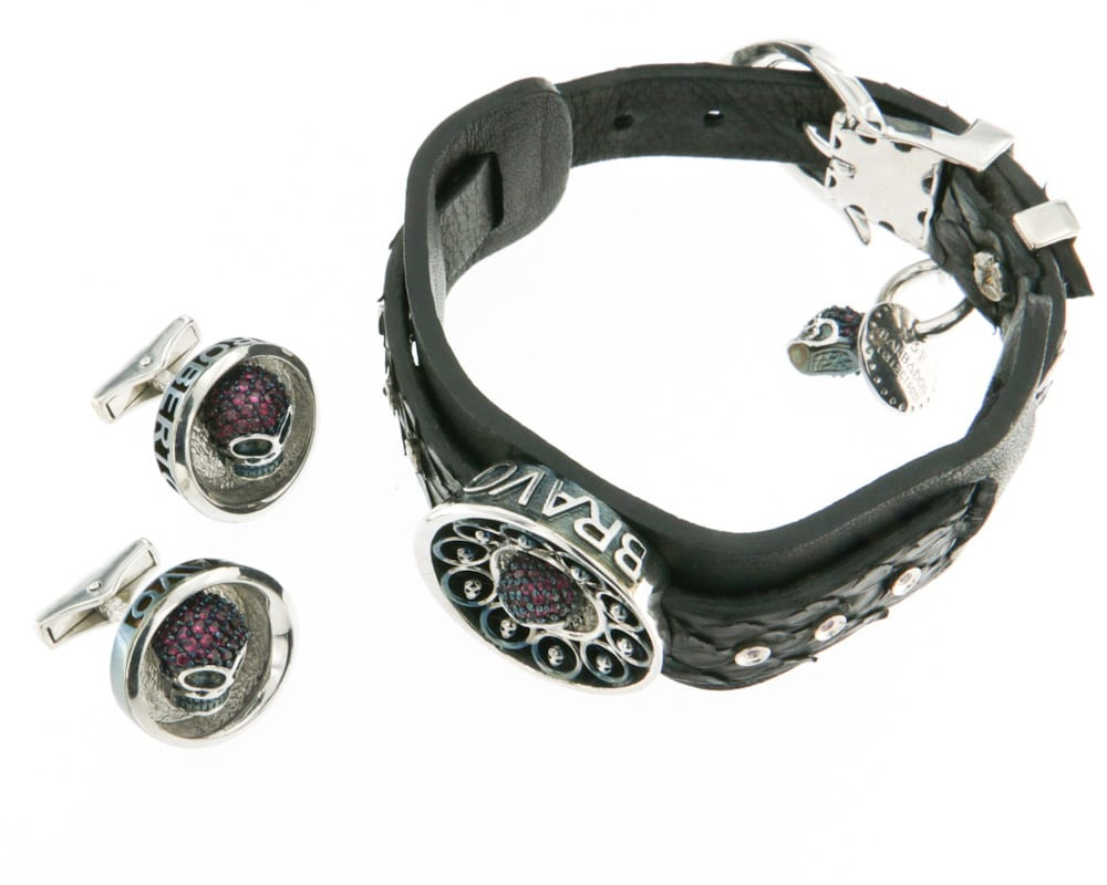 Комплект гривна и ръкавели от "Jacklin hugasian" сребро с позлата,кожа от питон и естествени рубини.