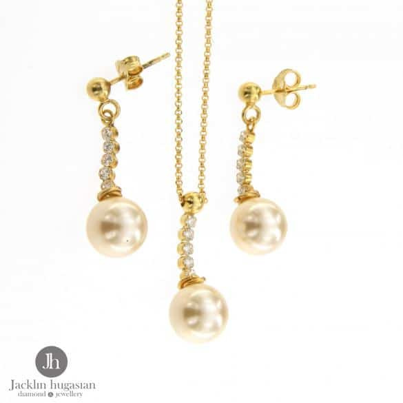 Комплект обеци и колие от "Jacklin hugasian" в сребро с позлата гланц с цирконии и култивирана бяла перла.