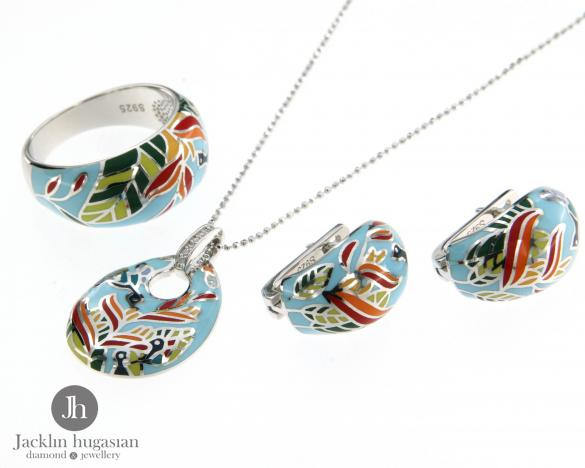 Комплект пръстен и колие от "Jacklin hugasian" в сребро с разноцветен емайл. Дължина колие 45 см. Колекция "TITI".