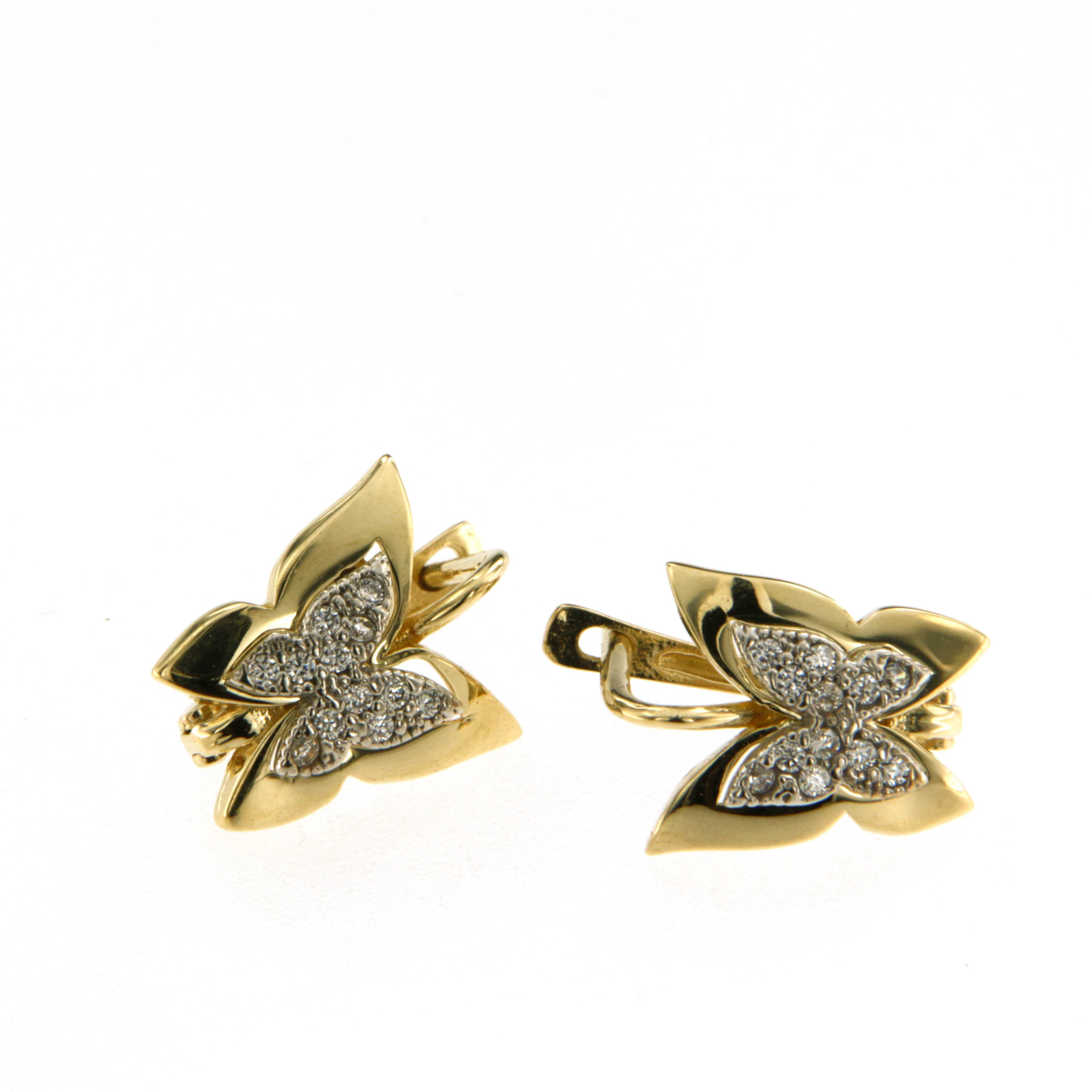 Обеци от " Jacklin hugasian " в жълто злато с цирконии.Дължина обеци 1.2 см., широчина 0.8 см.Произход Италия.