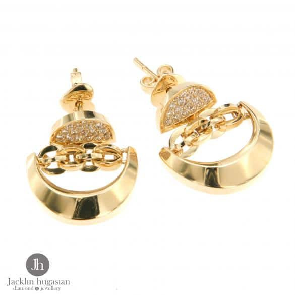 Обеци от "Jacklin hugasian" в жълто злато с цирконии. Дължина обеци 1.8 см. , широчина 1.4 см. Колекция "Roberto Bravo".
