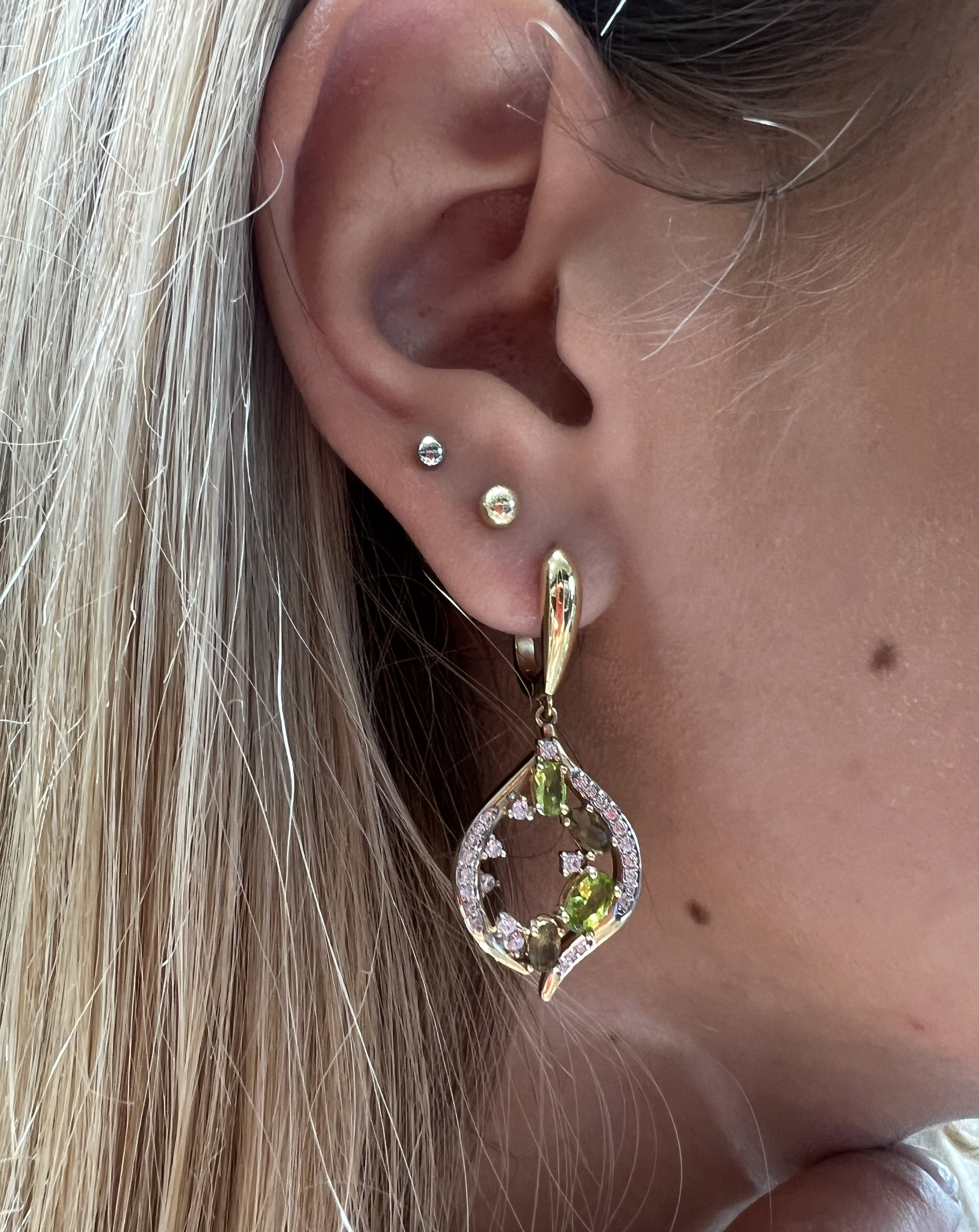 Обеци от “Jacklin hugasian” в жълто злато с перидот,топаз и циркони.