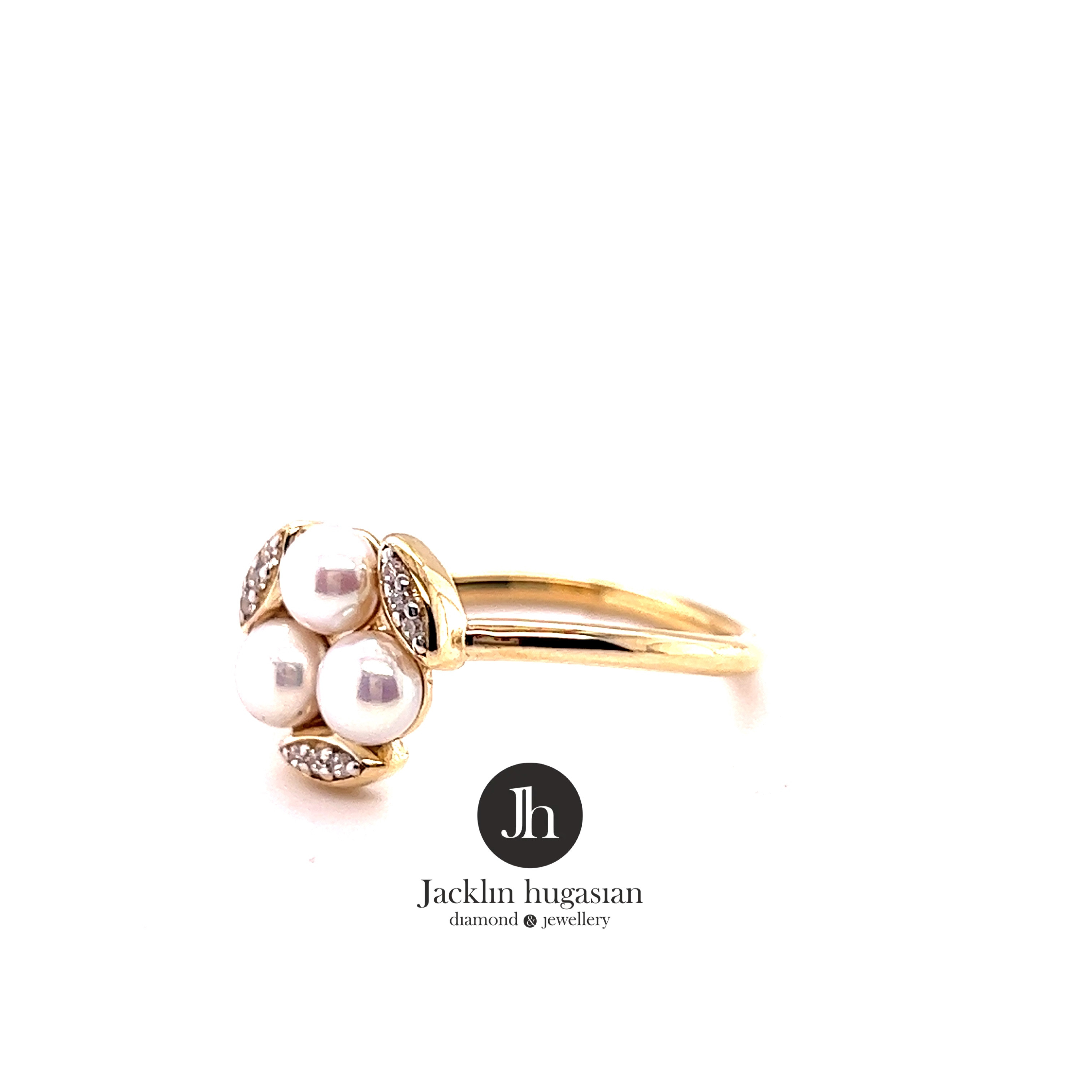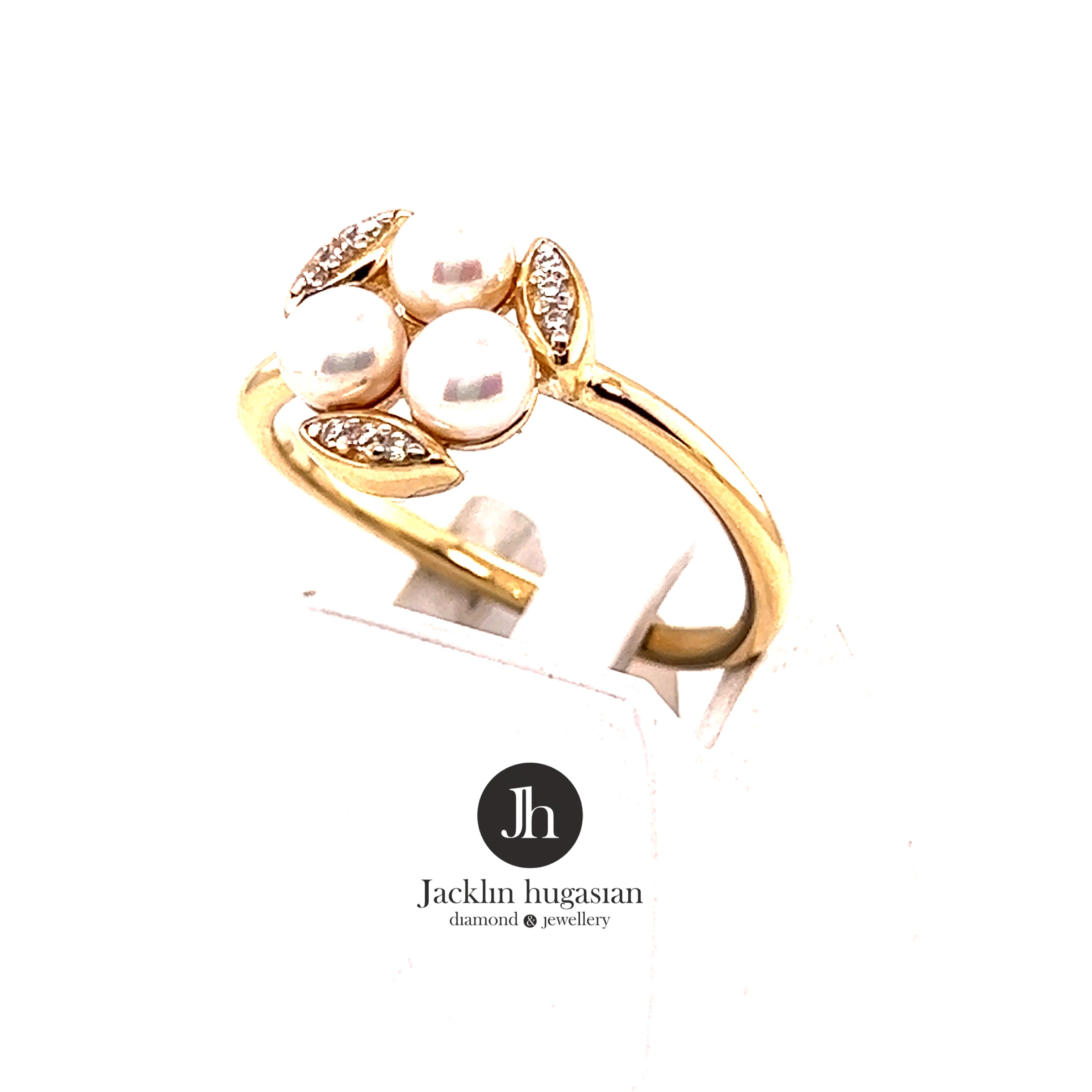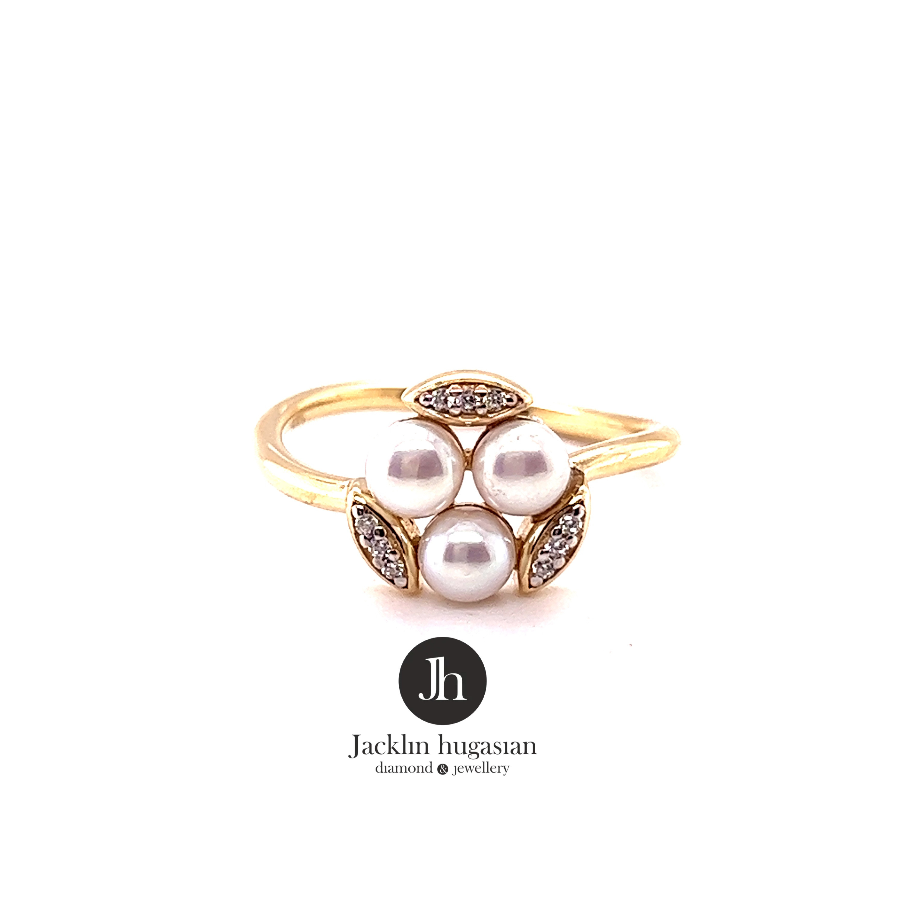 Пръстен от “Jacklin hugasian” в жълто злато с перли и циркони.