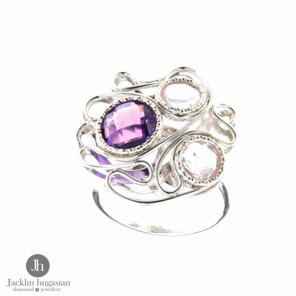 Пръстен от "Jacklin hugasian" в бяло злато гланц с лазерна шлифовка, лилав аметист и бледо розов кварц .