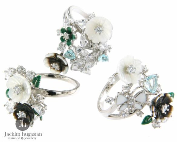 Пръстен от "Jacklin hugasian" в сребро със седеф, кралски седеф, цветен емайл и циркони.