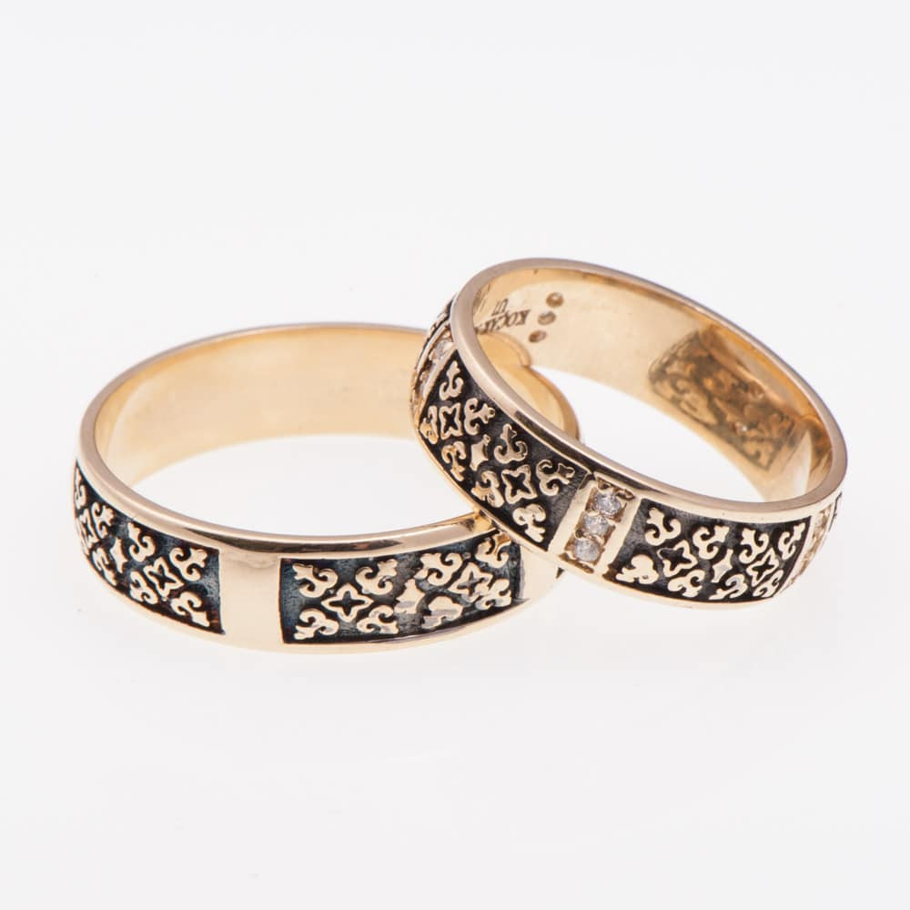Венчални халки от "Jacklin hugasian" комбинация жълто оксидирано злато и циркони.