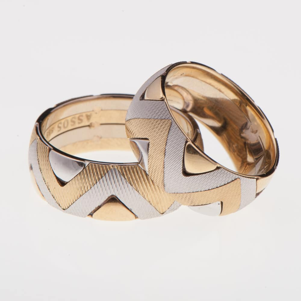Венчални халки от "Jacklin hugasian" в бяло и жълто злато мат и гланц.