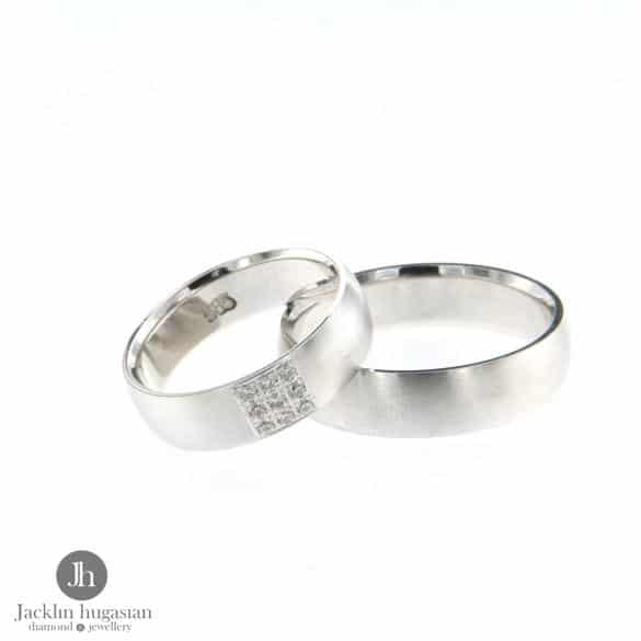 Венчални халки от "Jacklin hugasian " в бяло злато фин мат и цирконии.